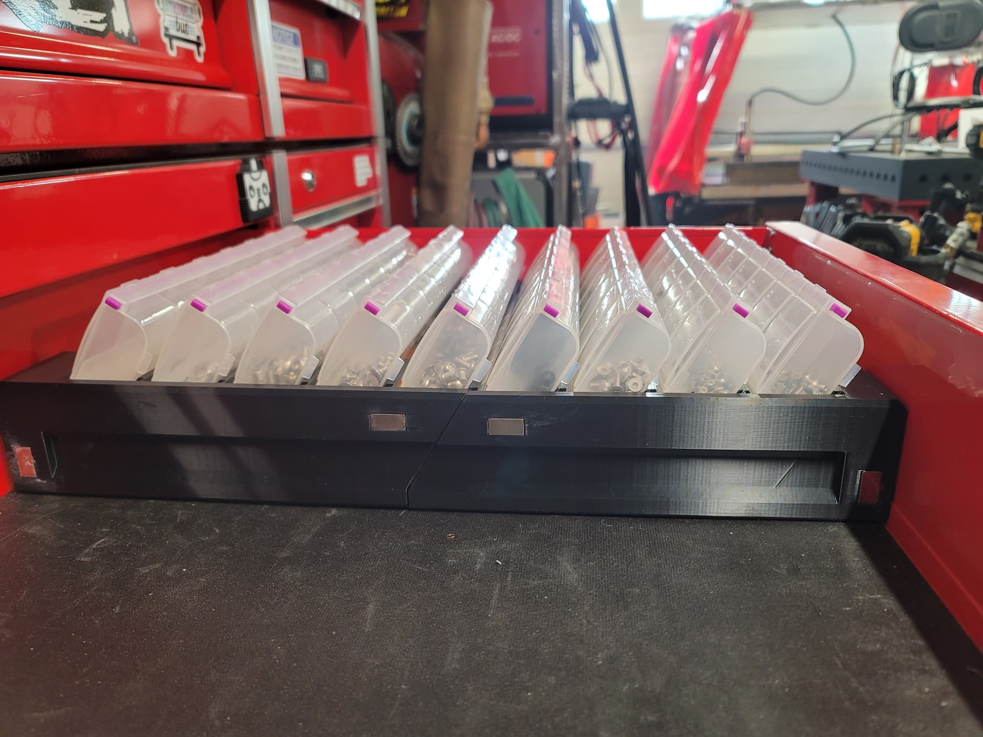 If you haven’t seen the CraftMates Lockables storage containers, they’re awesome. It solves what I hate about most case/bin storage solutions, which is the risk of stuff mixing/spilling or separating from the kit. They have lock bars that keep the bins closed, but allow you to open one without them all opening, so you don’t risk stuff mixing or spilling besides maybe whatever bins you choose to open. The only things missing for me was fast second order access, meaning open drawer, remove case. Having them stacked on top of each other in the drawer wasn’t that efficient a use of space, but more importantly meant digging into the stack to get th bin you want. Not a problem anymore.