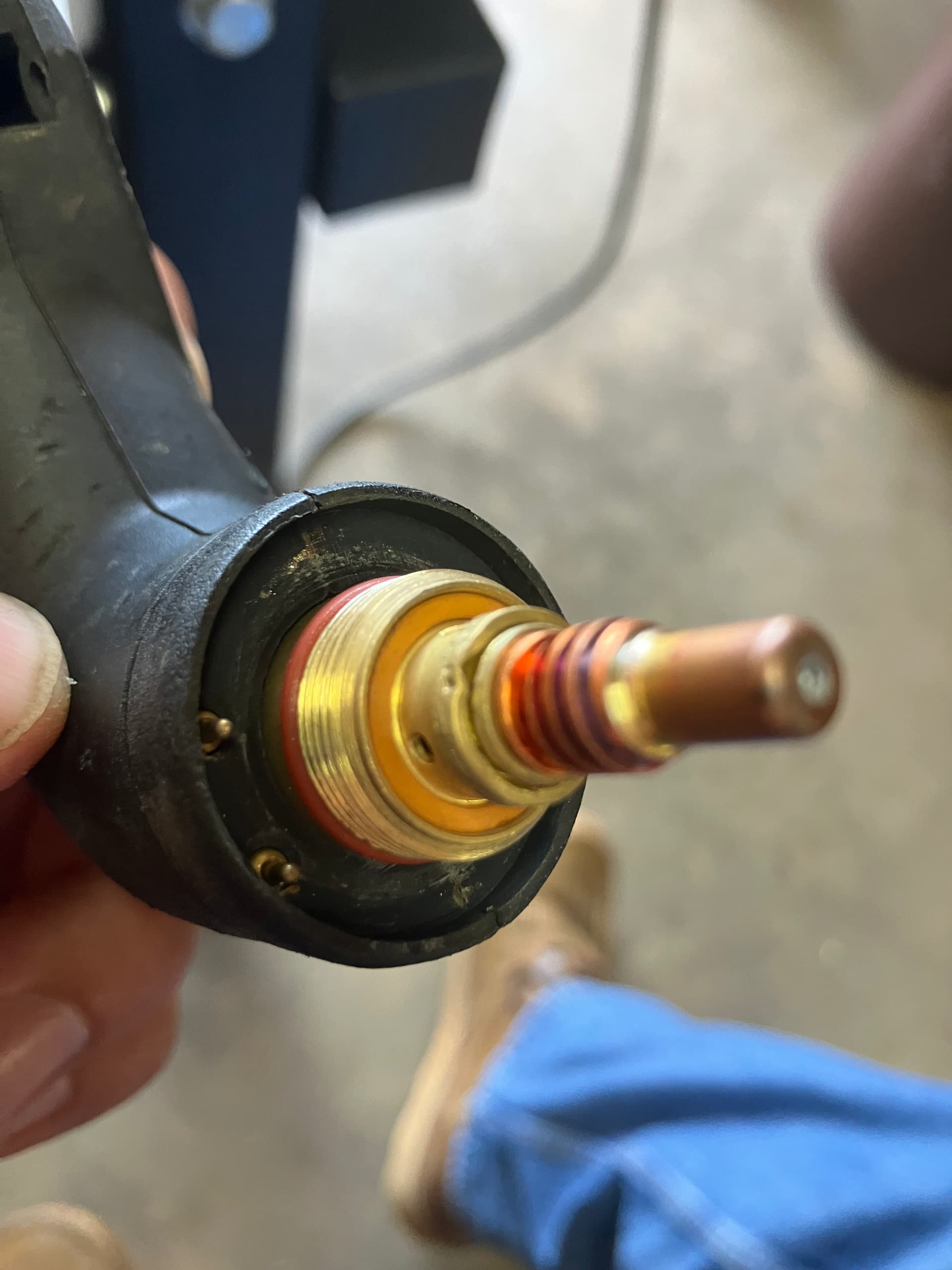 I would get with George, @mechanic416 . That torch appears to be cross-threaded or damaged in some way. Did someone put pliers or vise grips on it? George can get you a new torch head assembly if required. Does the electrode push up and snap back with your finger?