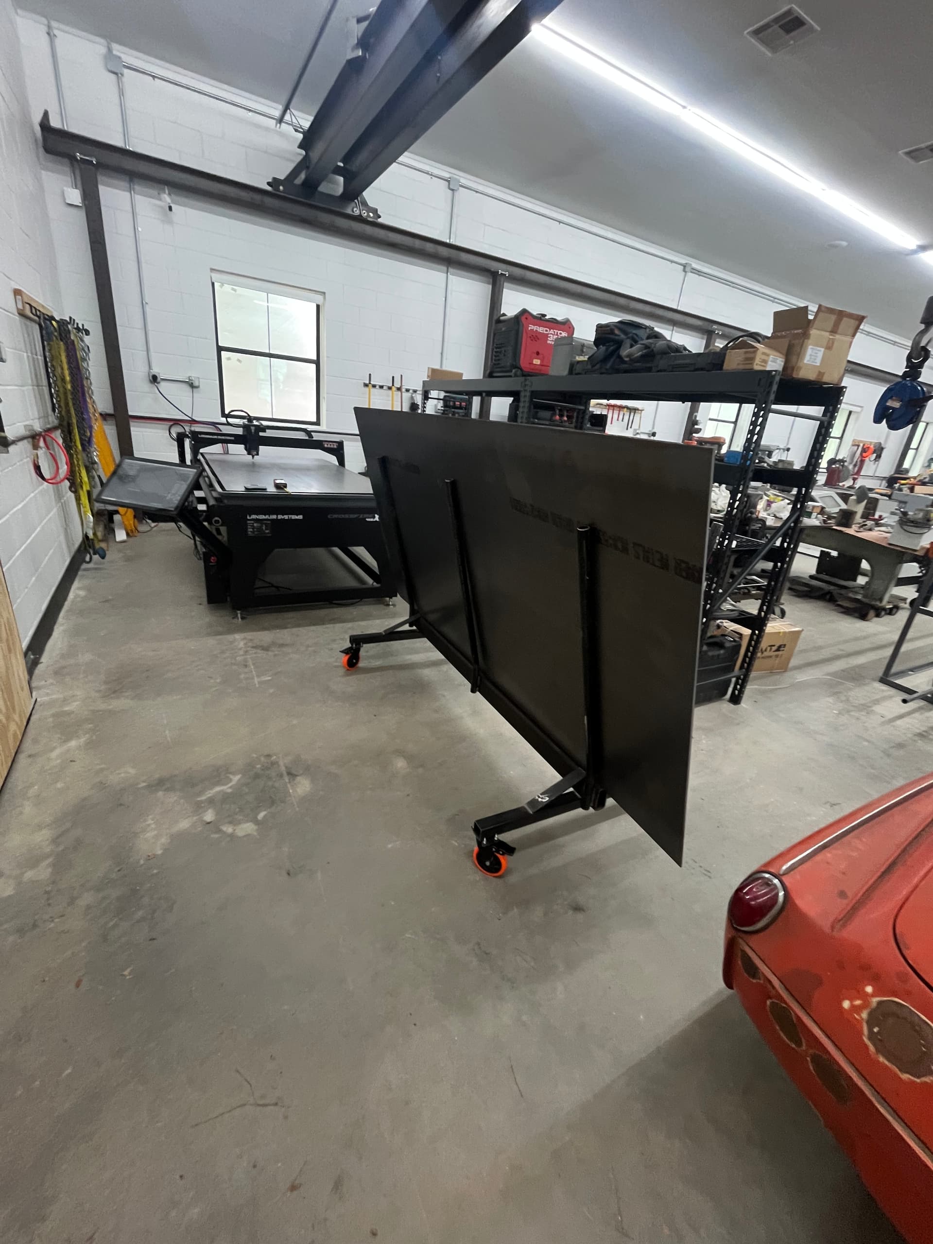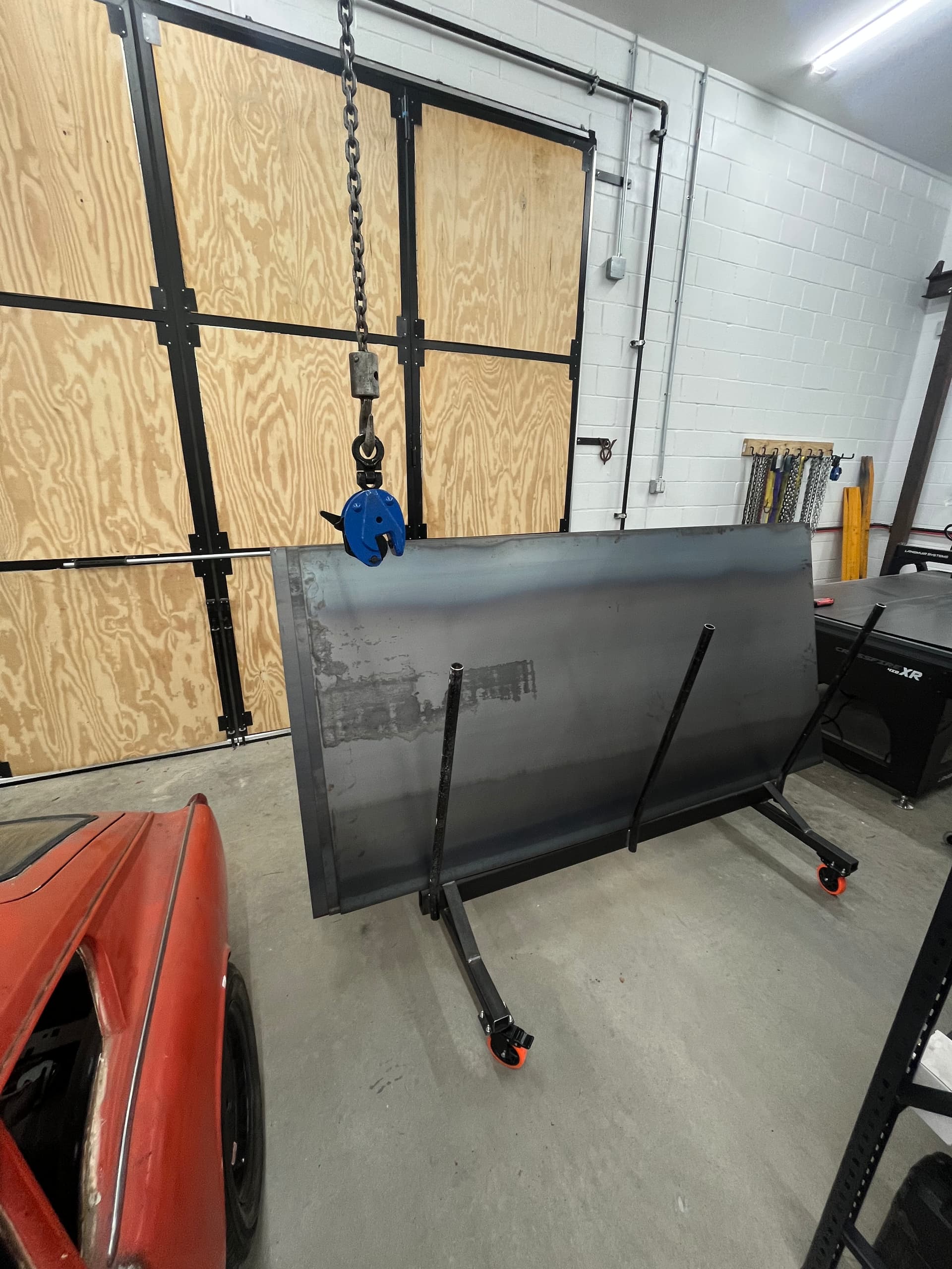 I recently built this cart for vertical sheet metal storage after growing tired of leaning them against the wall. The V shape makes it possible to flip through the sheets to get to the one I want, while keeping the footprint small.