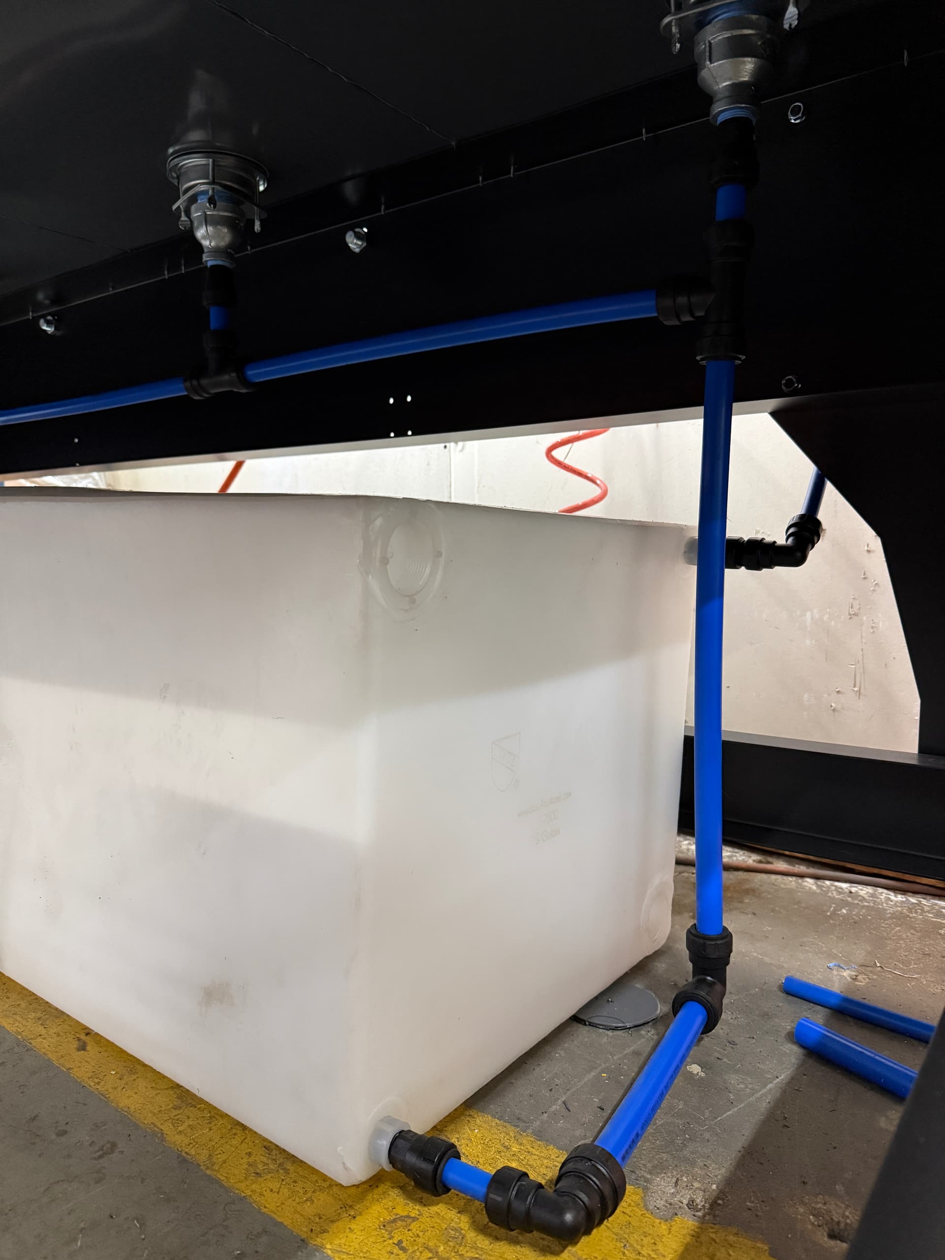 There are 1.5" threads on the water tank that you can cut a hole through in order to use, would be a much more efficient drain but I wanted something quick and easy that I knew would work. So I used the existing, smaller 3/4" (maybe 1/2") to run the water out. Putting a multi piece frankenstien connection on 65 gallons of water (the water tank says do not use metal threads) didn’t amuse me.