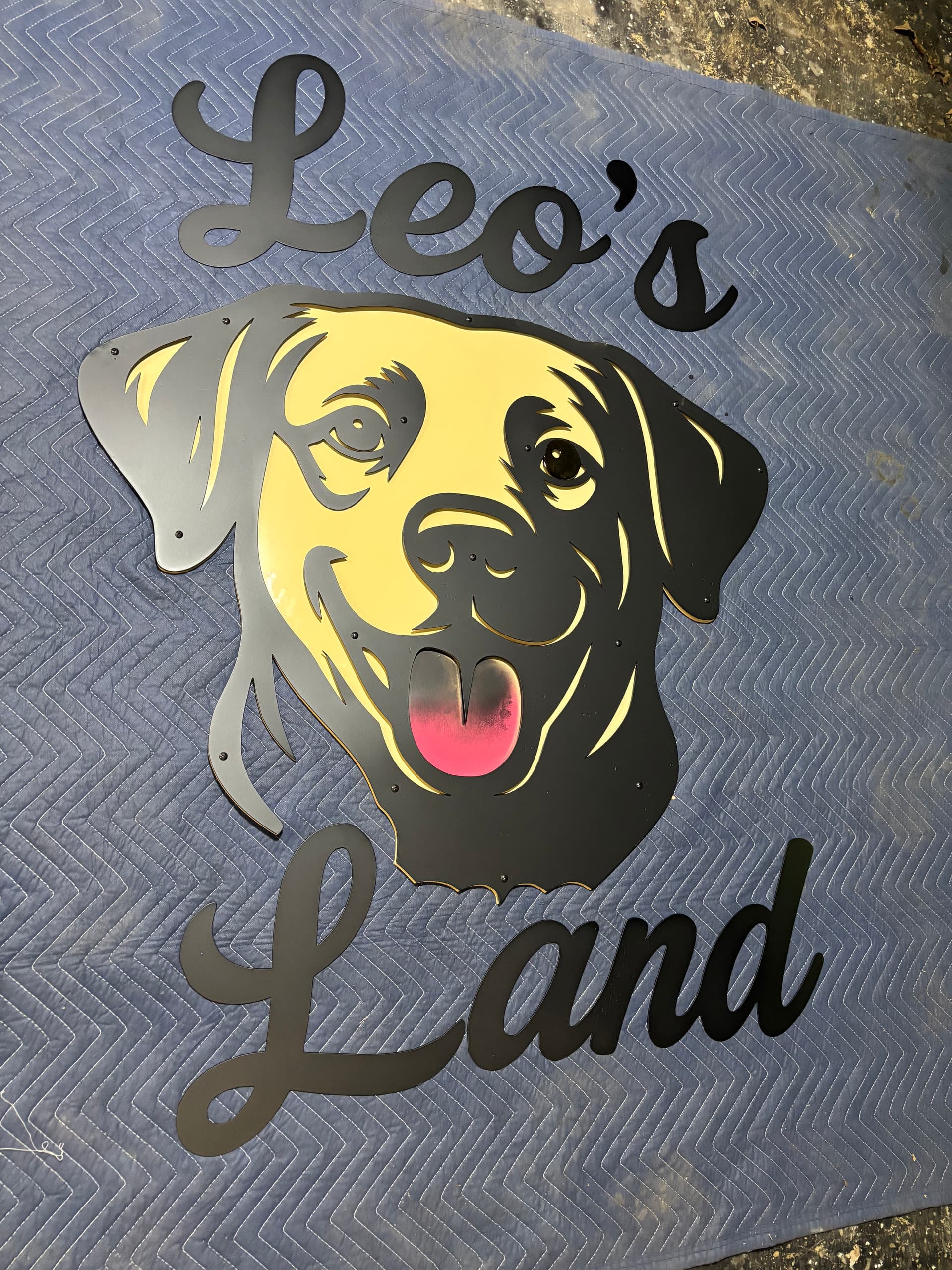 What is kind of cool is that my buddy used AI to transfer a photo of her dog into a DXF file to cut this. So this is a pretty accurate rendition of Leo. I am not really a big fan of AI, and I am too old to actually understand how a lot of it works, but Alex did a really good job in creating this image.