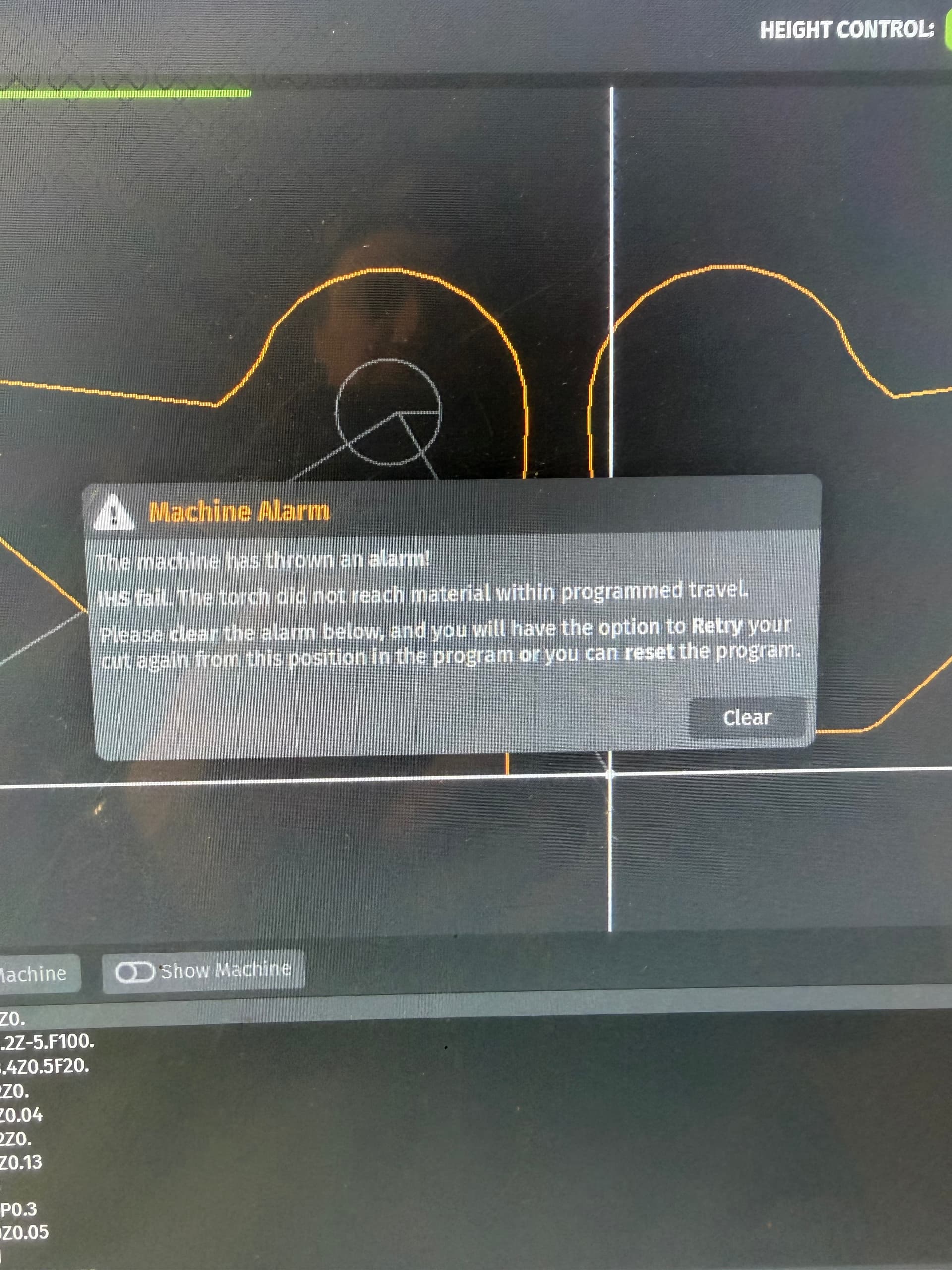 Okay got the new driver in that solved my problem there, now I am having a new issue. The torch cuts the first hole. Moves to the second one touches material and then throws this code.
